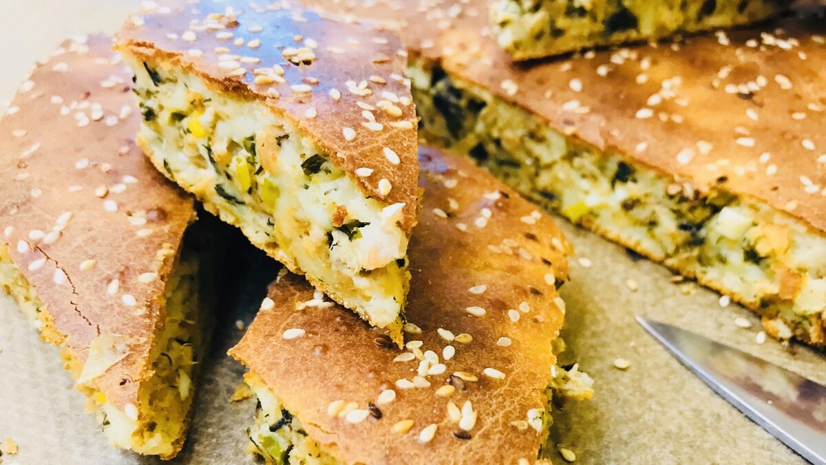 Много начинки, мягкое, нежное тесто - это простой пирог из любой рыбной консервы в собственном соку, яиц и зеленого лука. Этот заливной пирог одинаково хорош и в горячем виде, и в холодном. Лучше, конечно, ему дать остыть и только тогда нарезать. Но не всякий дотерпит, потому что аромат сумасшедший так и манит отведать кусочек. Видео рецепта (3,5 минуты) в конце статьи. РЕЦЕПТ: форма для запекания 24х32 см (или любая другая) тесто: мука в/с - 250 г, кефир - 300 г, сметана - 100 г, яйцо куриное - 2 шт., соль - 1/2 ч.л., разрыхлитель - 10 г начинка: рыбная консерва натуральная - 2 шт., яйцо куриное (сваренное вкрутую) - 2 шт., лук зеленый - небольшой пучок, укроп - 2-3 веточки дополнительно: сливочное масло - 5-7 г (для смазывания формы), панировочные сухари - 1 ст.л., кунжутные семечки - 1 ч.л. (по желанию). Тесто для пирога готовится очень быстро, поэтому начнем с начинки. Включаем духовой шкаф на 180 градусов. Форму для пирога смазываем размягченным сливочным маслом и посыпаем п