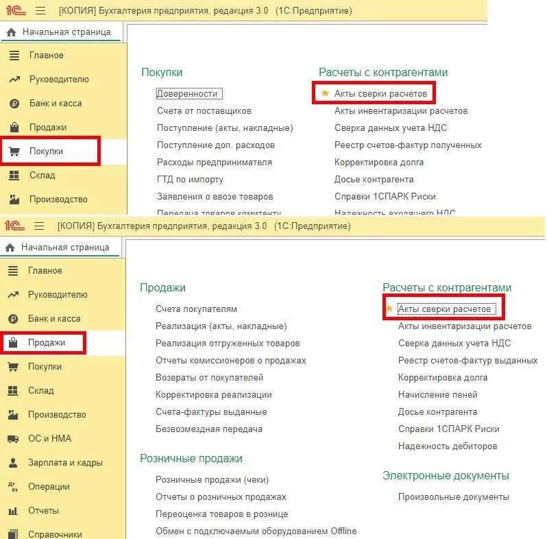 Расположение одновременно в разделах продаж и покупок осуществлено для удобства доступа к нему пользователем, но представляет собой одинаковый список объектов, в котором хранятся созданные пользователями сверки с контрагентами.
