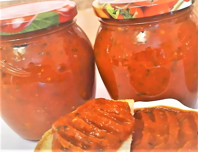 Соус "Лютеница" Вкуснейший соус из помидоров баклажанов и перца. Нам понадобятся продукты: 0,5 кг. помидоров (любых зрелых), 1 кг. болгарского перца, 0,5 кг. баклажан, 2 ст.л. сахара, 1-2 ст.л.растительного масла, 3 зубчика чеснока, соль и смесь перцев кладем по вкусу, 1-2 стручка острого перца чили, пряную зелень по вкусу, Приготовление: Промываем болгарский перец с баклажанами, высушиваем бумажным полотенцем, выкладываем на противень и запекаем в духовке минут 12. Затем достаем из духовки, остужаем и снимаем аккуратненько кожицу. И все прокручиваем через мясорубку вместе с подготовленным перцем чили и зеленью. Помидоры обдаем из чайника кипятком, затем остужаем и снимаем с них кожицу и разминаем их в пюре. Ставим в кастрюлю на огонь и увариваем томаты до уменьшения в два раза. Затем к помидорной массе добавляем прокрученный перец с баклажанами, соль, сахар и варим помешивая деревянной ложкой. Соус лютеница будет готов когда перестанет выделяться лишняя жидкость. Затем про