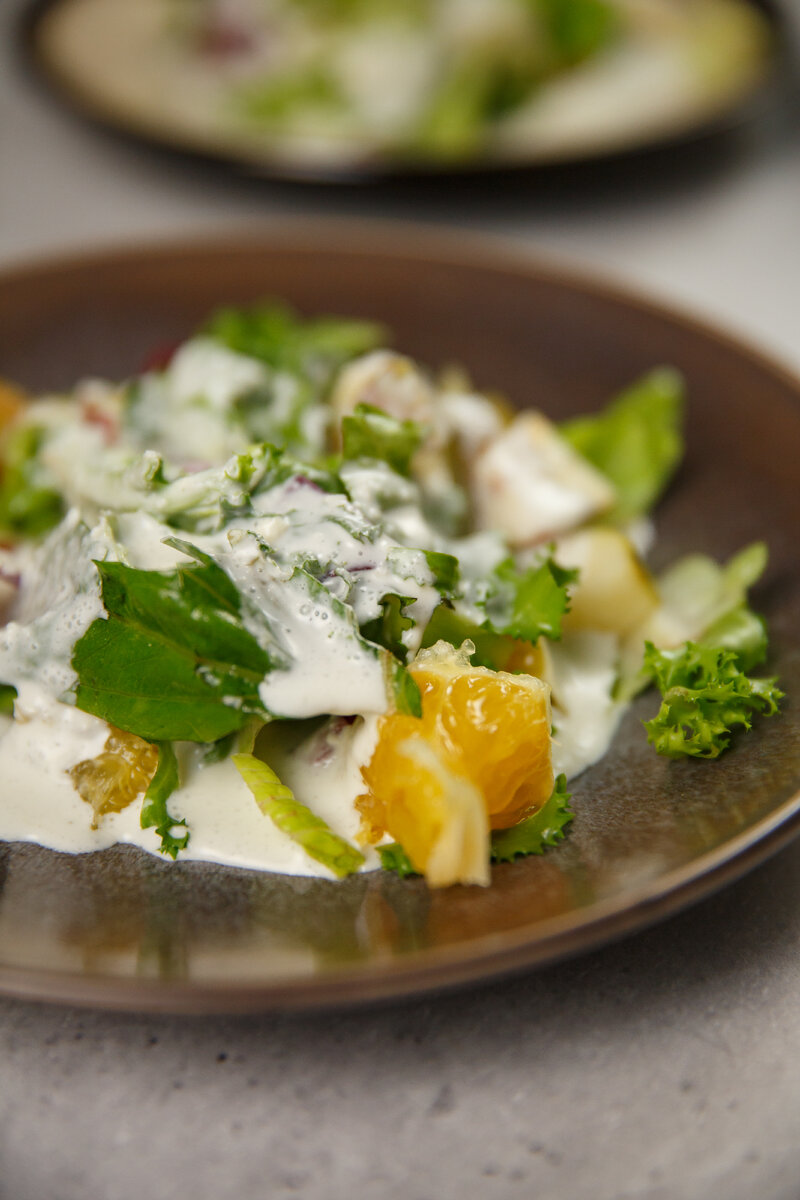 Подаём салат порционно, поливая зелень и фрукты соусом.