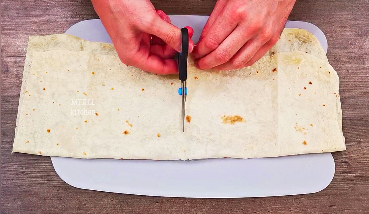 Для приготовления понадобится тонкий лаваш 1,2 листка. Лист лаваша нужно нарезать на четыре равные части. Я делаю это с помощью ножниц, ими удобней всего.