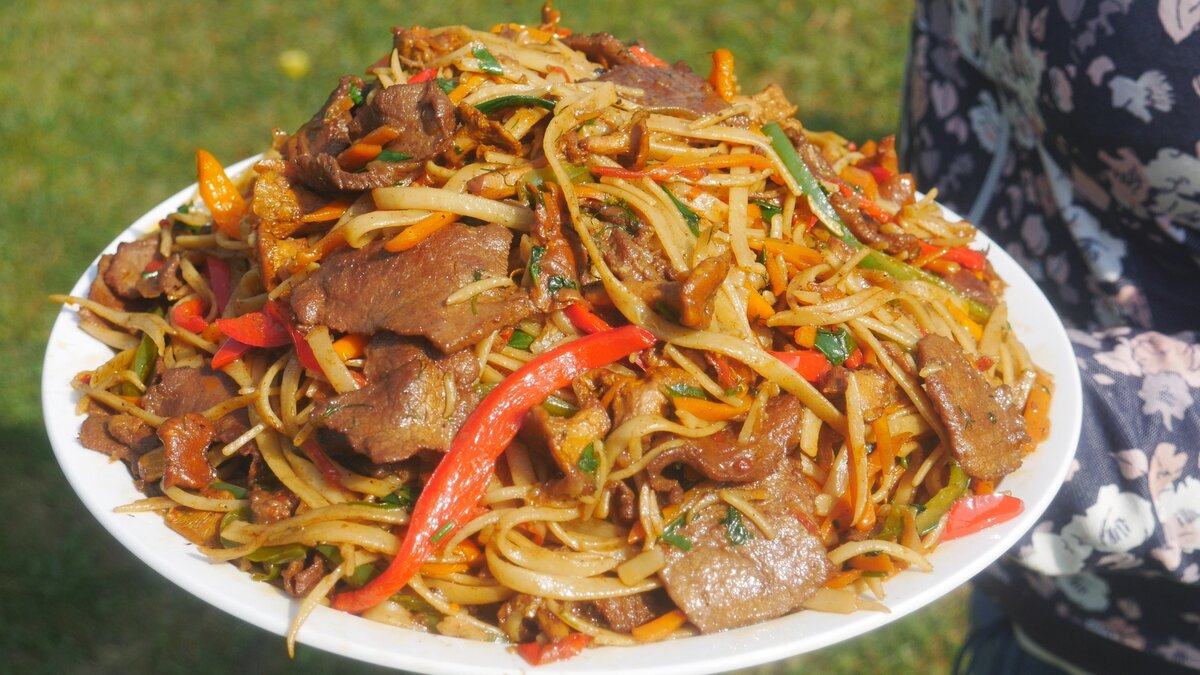 Друзья,приготовьте простое,быстрое и очень оригинальное блюдо.Лапша, обжаривалась с мясом ,грибами и овощами ,с добавлением соевого соуса,перца чили,чеснока.Это стоит приготовить! Потребуется: Лапша,которую я отварила до полуготовности,телятина,грибы( у меня лисички) лук,чеснок,морковь,болгарский перец,перец чили,зелень,раст.масло,соевый соус ,паприка,перец,имбирь,соль. Кладу мясо в большую емкость,добавляю раст.масло 3 ст.л.,соевый соус 100 мл. паприку,перец,имбирь и все хорошо перемешиваю. Лук,морковь, перец нарезаю соломкой,перец чили и чеснок дольками. Все ингредиенты готовы иду к казане. В казан наливаю раст.масло 150 мл. и жду,когда нагреется. Масло нагрелось,первым закладываю перец чили и чеснок.Обжариваю минуту т.е. ароматизирую масло. Добавляю лук и обжариваю 3 мин. Закладываю телятину,нагрев в казане хороший.Обжариваю мясо 5-7 мин. т.к. оно нарезано очень тонко. Добавляю морковь и обжариваю быстро 1-2 мин. В казан идут грибы, перемешиваю и жду минуту.