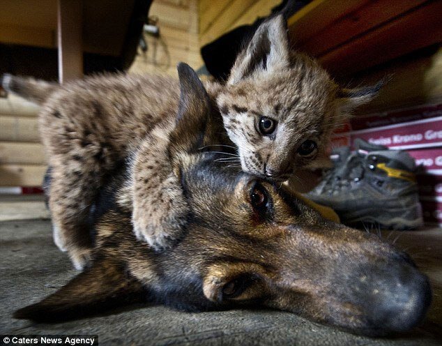 Немецкая овчарка Лилика (Lilica) обожает своих трех лучших друзей, рысят Лизу, Вики и маленького самца Мьюро.