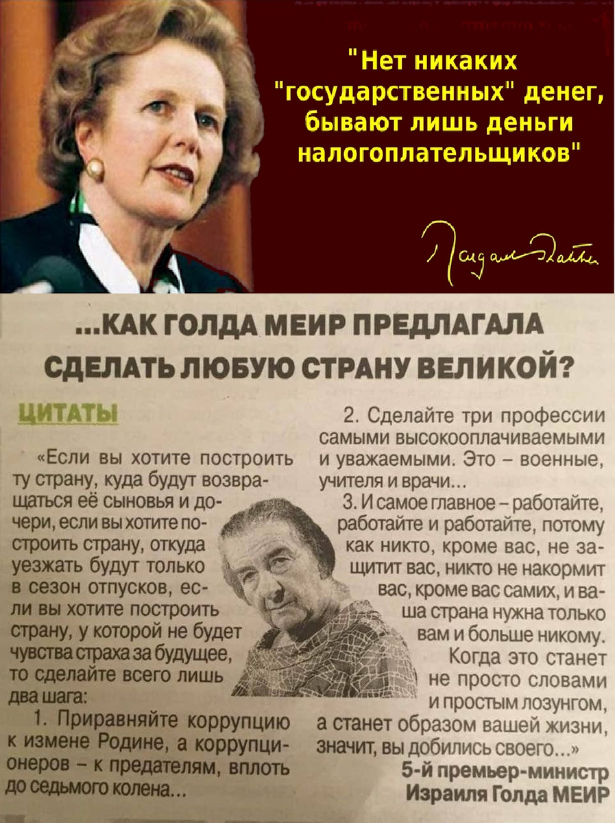 Популизм и несправедливость этой цитаты должен выворачивать наизнанку любого нормального человека, но в зазеркалье происходит прямо обратное – интеллектуальные инвалиды носятся с ней как курица с яйцом, абсолютно не понимая, во-первых, причин коррупции; во-вторых, мифичности социальных функций государства, в-третьих; отсутствия тождества между понятиями «работа» и «труд». Я практически уверен, что не понимала этого и Голден Меир, иначе данный тезис бы не просто убогим с интеллектуальной стороны, но и лицемерным, безнравственным.