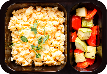 Завтрак 1 Скрэмбл Меланж, чеснок, масло подсолнечное, вода, соль. Запеченные овощи Кабачок, перец болгарский, чеснок, тимьян, масло подсолнечное, соль. Завтрак 2 Морковный пирог Морковь, меланж, кефир 2,5%, корица, орех мускатный, мед, грецкий орех, клюква, масло подсолнечное, мука пшеничная, сахар, разрыхлитель, ванилин. Ванильный крем с маком Продукт, произведенный по технологии творога, мак, сахар, ванилин. Обед Куриная котлета в сливочно-грибном соусе Котлета куриная (куриное бедро, куриное филе, лук репчатый, меланж яичный, сухари панировочные, перец белый, соль, чеснок гранулированный, лук сушеный), соус сливочно-грибной (сливки 22%, шампиньоны, морковь, мука, масло оливковое, масло подсолнечное, лук репчатый, чеснок измельченный, соевый соус, перец белый, сванская приправа, соль). Гречка с паприкой Греча, масло подсолнечное, перец болгарский, вода, соль. Полдник Ролл с лососем Рис, лосось, меланж, сыр творожный, такуан, майонез, сахар, соус рисовый Мирин, водоросли морские жарен