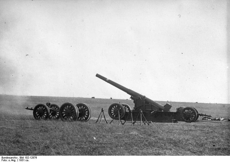 Орудие было разработано во Франции фирмой Schneider, как это видно по названию, в 1917 году. В ней были реализованы некоторые технические новинки, получившие впоследствии достаточно широкое развитие в тяжелой артиллерии всего мира. Конкретно - использована схема двойного отката: установленный в люльке ствол откатывался назад вместе с люлькой по направляющим верхнего станка лафета, а сам верхний станок в свою очередь на четырех роликах откатывался назад-вверх по направляющей рамы лафета. Этот эффект у тяжелых орудий можно пронаблюдать в старых советских фильмах про Вторую мировую войну, обычно в финале, в качестве постскриптума. Для устойчивости на позиции рама лафета опускалась на грунт, металлические колеса при этом при помощи гидравлических домкратов поднимались вверх и вывешивались над грунтом. Чтобы повысить маневренность тридцатитонного орудия (16-тонного лафета и 13-тонной повозки для ствола, сам ствол весил 9 тонн, которые тащили по два тягача), фирма Schneider предложила уста