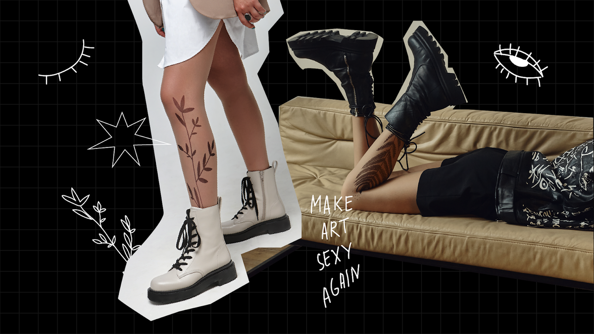 Это рисунок художницы Евгении Страховой в стиле наивного искусства. Несколько картинок разбросаны по обеим ногам (звучит смешно, ага), а главный акцент – надпись на правой ноге «Make art sexy again».