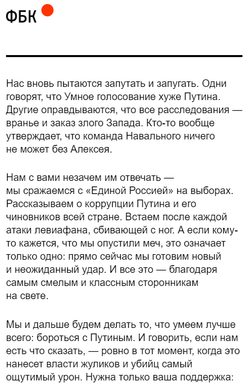 Всем хой, товарищи! Как вам стало понятно из названия снова необоснованная претензия красного ватника. Поехали! Очередное юморное письмо из рассылки ФБК. Вот полный текст: “Нас вновь пытаются запутать и запугать.” - Ууу, страшный путинский тоталитаризм, нас пугают, нас преследуют. Прошерстив новости за последнее время было только про Соболь и Ярмыш за то что они призывали людей нарушить санитарные нормы. Двойные стандарты: на прогосударственные массовые мероприятия собирать - плохо, на оппозиционные митинги - нормааально. “Одни говорят, что Умное голосование хуже Путина.” - Неее, не хуже. Вон какие результаты, кардинальная перестановка внутриполитических сил. Особенно в сравнении с 2011-2016 годами. - “Другие оправдываются, что все расследования — вранье и заказ злого Запада.” - Пфф, какое враньё, всё по чесноку. Особенно видосы про дворец солнцеликого и звонок отправителю. Никаких сомнений. - “Кто-то вообще утверждает, что команда Навального ничего не может без Алексея.” - Какие сомне