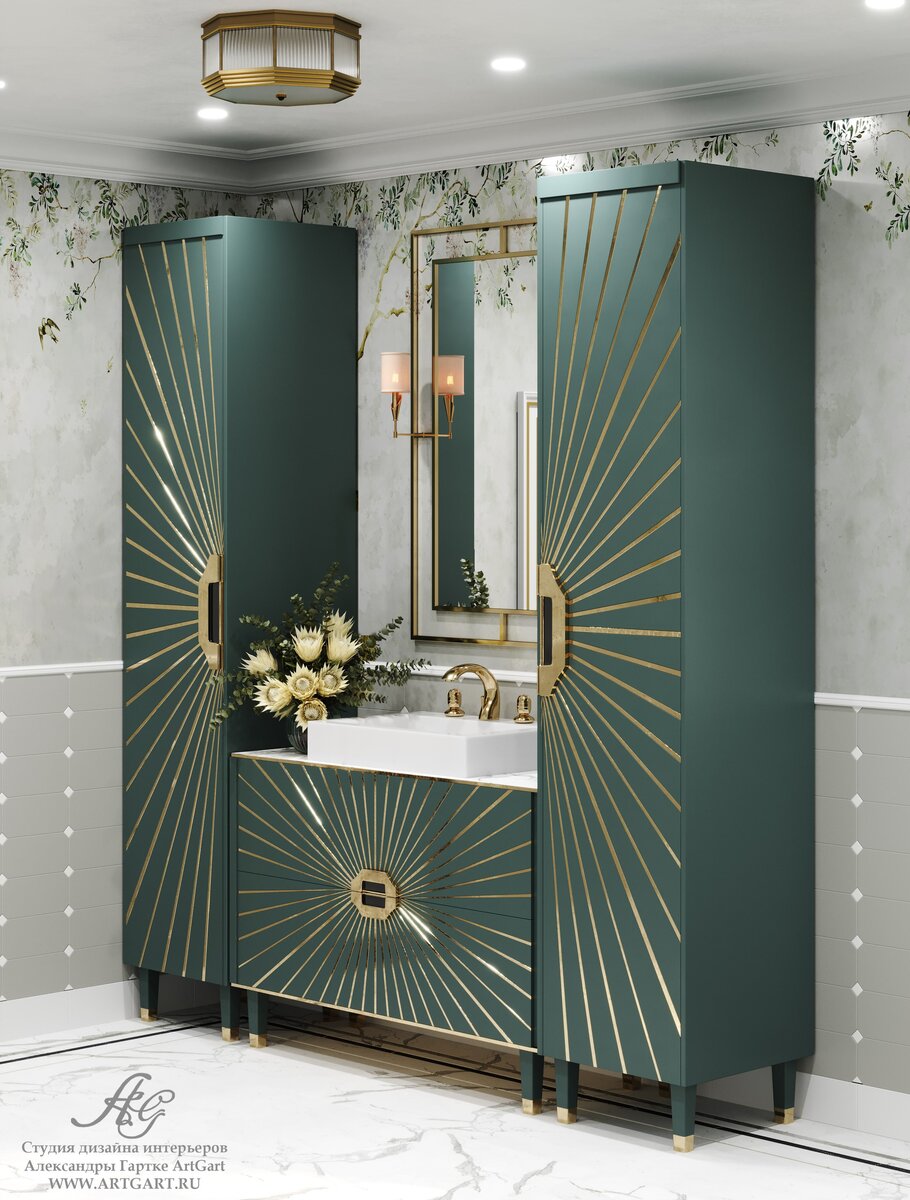 Каждая ванная комната в этом проекте словно шкатулка с драгоценностями #крона680 Сегодня представляем вашему вниманию Изумрудную💚 Плитка мелкая с ромбовидными вставками, внизу заканчивается широким белым бордюром. В душе она же, но в однотонном варианте. Также на стенах обои-фреска с природным орнаментом, не боящаяся ни влажности, ни перепадов температур! На полу белая плитка под мрамор с темной окантовкой. Этот контраст необходим, чтобы достичь сочетания с темной дверью. Мебель с декоративными элементами, напоминающими лучи восходящего солнца, выполнена по нашим эскизам. Поэтому всю сантехнику мы тоже подобрали в золотом цвете. Зеркало-бра - единая конструкция. В этой комнате два окна. Напротив них расположилась отдельно стоящая ванная в дополнение к душевой кабине каждый день. Не забудьте подписаться на канал Сайт INSTAGRAM YOU TUBE Заказать дизайн и ремонт: +7 (499) 346-62-29 ; +7 (969) 034-60-46 #дизайн интерьера #дизайн интерьера москва #дизайн дома #дизайнер интерьера моск
