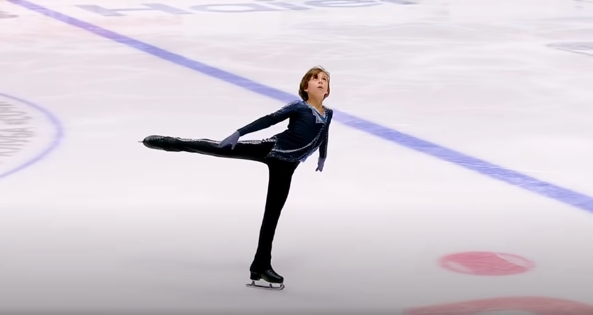 Николай Колесников завоевал золотую медаль на третьем этапе Кубка России среди юниоров поднявшись с 8 места после короткой программы. Двенадцатилетний ученик Этери Тутберидзе - Николай Колесников смог исполнить три четверных прыжка в произвольной программе. Фигурист почти чисто исполнил два четверных - сальхов и тулуп в каскаде с двойным тулупом (оба прыжка не были докручены идеально, но недокруты были засчитаны в пользу спортсмена). На третьем четверном прыжке - сольном тулупе техническая бригада отметила недокрут. Во второй половине программы были допущены ещё две ошибки - каскад 3Л+ойлер+3С (степ-аут с лутца) и недокрут с падением на тройном лутце. Николай получил бонусные баллы за исполнение двух четверных прыжков и за последние комбинированное вращение, выполненное на хорошей скорости. Протокол: Очень харизматичный парень, надеюсь у него будет длинная и успешная карьера. Поздравляю с победой! Видео: Табличка: