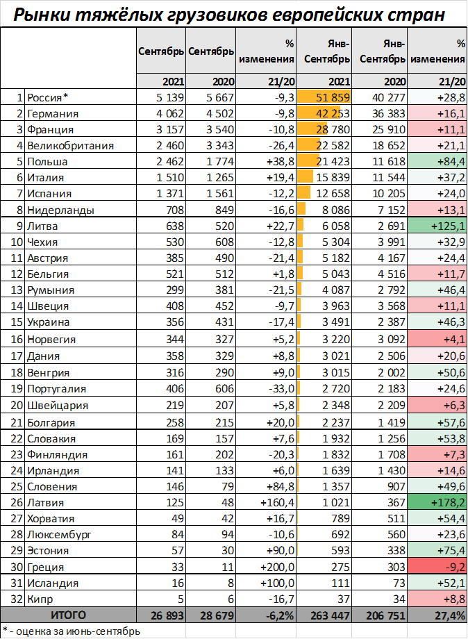По итогам девяти месяцев 2021 года Россия занимает первое место по объёму рынка тяжёлых грузовиков среди европейских стран. За эти девять месяцев рост рынка 32 стран, представленных в таблице, составил 27,4%. Стоит отметить, что в сентябре рост предыдущих месяцев сменился падением на 6,2%. Среди крупнейших рынков (с продажами в сентябре более 1 тыс. шт.) только Польша и Италия продемонстрировали рост. Продажи за последние 12 месяцев по крупнейшим рынкам приведены на графике. На графике видно, что рост большинства крупных рынков прекратился, в сентябре падение отмечено и в России. Напомним, что речь идёт о рынке грузовиков (не о производстве), то есть о количестве проданных на территории страны грузовиков, вне зависимости от места их производства. *- тяжёлые грузовики - грузовики полной массой более 16 тонн. P.S. Ориентироваться в моих статьях, заметках и видео удобно через НАВИГАТОР Раньше всего материалы публикуются в Дзен и Телеграм Телеграм : https://t.me/m2econ Дзен : https://zen.y