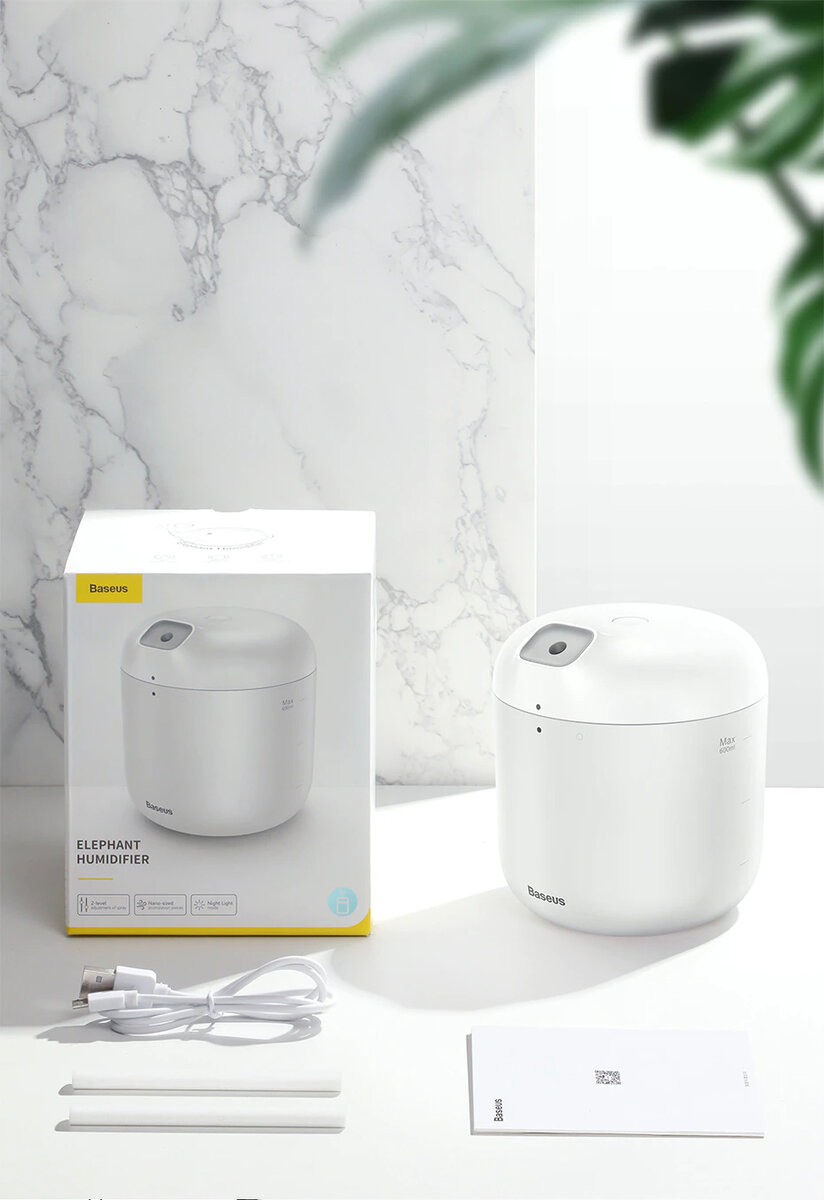 Baseus Smart Увлажнитель. Хороший вариант для дома и офиса – это увлажнители, которые имеют функцию увлажнения воздуха в помещении. В наличии имеется большая емкость и светодиодная лампа, генератор тумана. Характеристики ароматерапевтического диффузора: Емкость резервуара для воды: 600 мл Размер: 125*110*110 мм Напряжение: 5В Длина кабеля USB: 1метр Время использования: 15-24 часа Низкий уровень шума. Режим синхронизации, различные варианты, чтобы удовлетворить ваши потребности: 1-й уровень спрей приносит быстрое увлажнение 2-й уровень мягкий спрей приносит нежное увлажнение Мощность распыления намного больше, чем у существующих небольших увлажнителей на рынке. Может быстро уменьшить сухость воздуха в помещении. Нажать и удерживать 2 секунды чтобы переключиться на ночной спокойный режим. Увлажнитель выполнен с уплотнительным кольцом, который защищает воду от утечки, даже если он падает. Большая емкость – 600 литров, позволяет избежать повторного добавления жидкости в течении 15-24