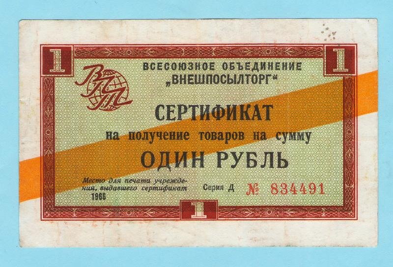 3) чеки с желтой полосой - выдавались за валюту развивающихся стран, с понижающим коэффициентом от 1,1 до 1,9. Например, за валюту Мали был установлен коэффициент 1,8, за сумму равную 400 руб, можно было получить 400/1,8 - 222 чека.