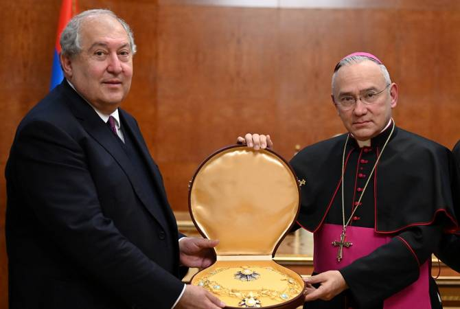Его Святейшество Папа Франциск наградил президента Республики Армения Армена Саркисяна высшим орденом Святого Престола Орденом Папы Пия IX: «Grand Collar of the Papal Order of Pius IX», который Армен Саркисян заслужил за большой вклад в дело развития отношений между Арменией и Святым Престолом. Как передает «Арменпресс», об этом говорится на официальном сайте президента РА. «Папа поручил мне вручить Вам высшую награду Ватикана. Это свидетельство уникальных отношений, существующих между нашими странами. Открывая Апостольскую нунциатуру в Ереване, мы хотим установить очень высокий уровень отношений, чтобы показать миру какое значение имеет для нас первая в истории христианская нация», - сказал заместитель государственного секретаря Святого Престола, находящийся в настоящее время в Армении. Было отмечено, что президент Саркисян первым в Армении, единственным в регионе награжден высшим орденом Святого Престола - Орденом Папы Пия IX. Армен Саркисян, ответил, что получение этой высокой награ