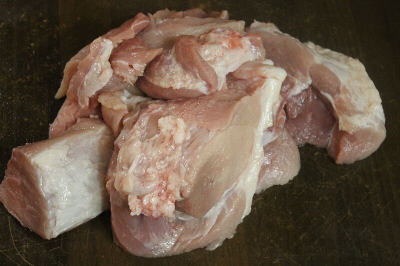 Мясо нарезаем среднего размера кусочками, лук измельчаем кто как может. Мне лень очищать мясо от в труху измельченного лука и поэтому я режу его полукольцами и мну с солью, чтобы он пустил сок.