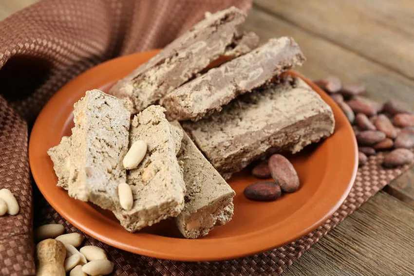 Тем, кто любит восточные лакомства, а также полезные сладости, рекомендуется обратить внимание на легкий рецепт халвы из орехов с медом. Его можно приготовить не только из миндаля, но и из фундука или каких-нибудь других орехов, а дополнительно можно добавить кунжут или подсолнечные семена. Ингредиенты: Процесс приготовления: Миндаль переложить в небольшую посуду и залить крутым кипятком, оставить на пятнадцать минут при комнатной температуре, очистить от оболочки и переложить на сковороду. Добавить подсолнечные семена и насыпать кунжут, обжаривать ингредиенты без масла при периодическом помешивании две минуты, затем остудить. Переложить половину орехов и подсолнечных семян в миску и измельчить блендером до состояния мелкой крошки, добавить густой мед и несколько минут вымешивать сладкую массу. Помельче порубить оставшиеся миндальные орехи и подсолнечные семена, отправить в ту же посуду, насыпать кунжут, тщательно перемешать ингредиенты. Подготовить небольшую форму и застелить ее фоль