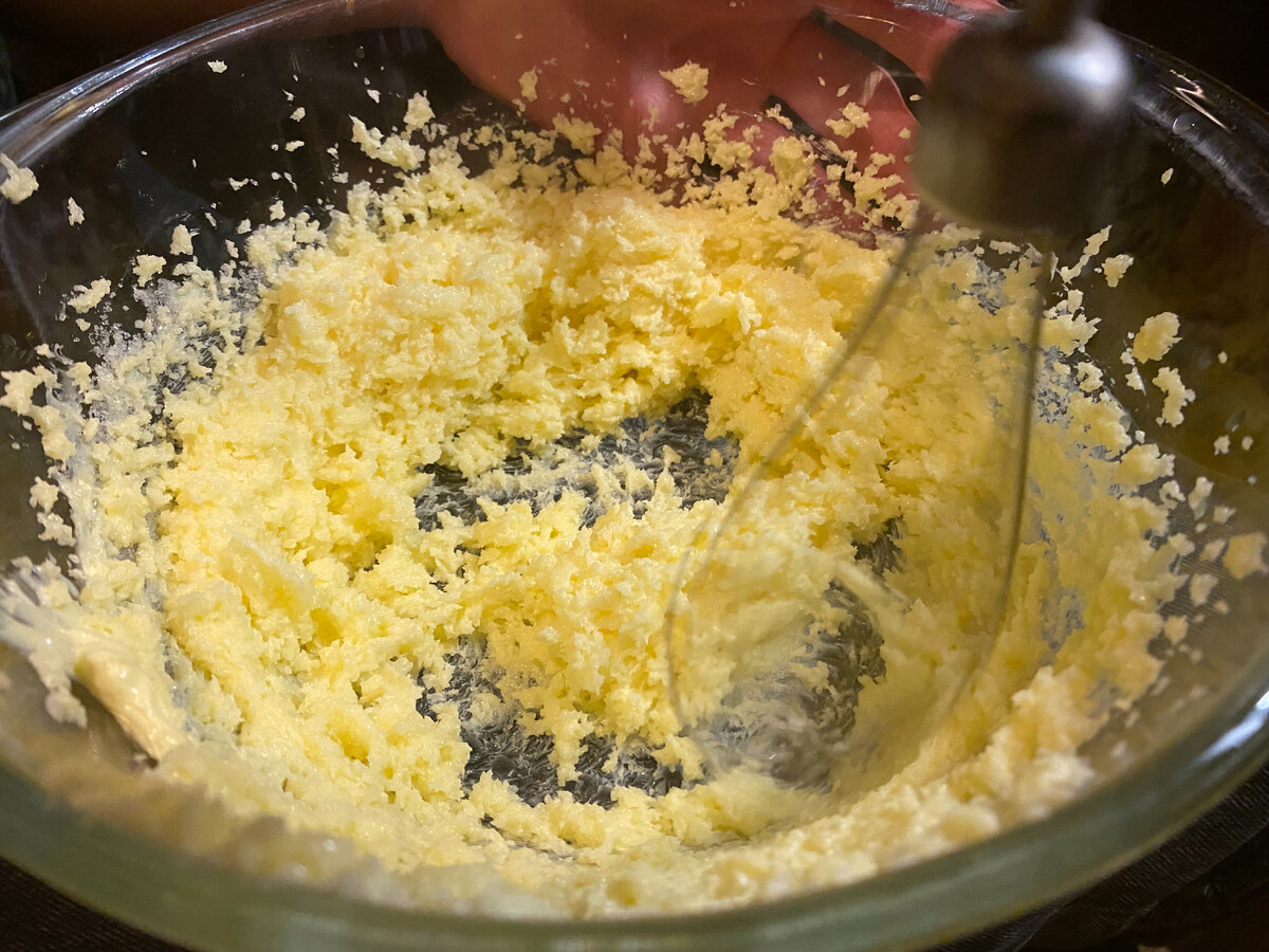 1. Сливочное масло комнатной температуры взбиваем (миксером или блендером) с сахаром, пока оно не побелеет и не станет пышным.