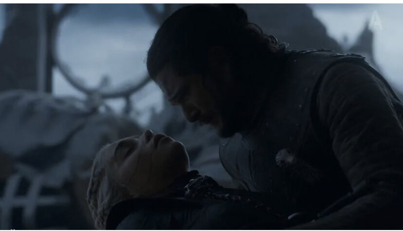 До Джона, который никогда не отличался волевым сильным характером, неожиданно доходят слова Тириона. Он идет к своей Королеве и убивает ее. «Ты моя королева. Ныне и всегда», — говорит Джон, целуя Дейнерис и пронзает ей сердце кинжалом. Почувствовав кровь хозяйки, в зал влетает Дрогон. Он не трогает Джона, но от горя решает расплавить ненавистный Железный трон. То, за что ценою собственных жизней и жизней тысяч других людей на протяжении всего сериала боролись претенденты на корону, стирается с лица земли. Затем Дрогон берёт мёртвую Дейнерис в одну из лап и улетает в неизвестном направлении.