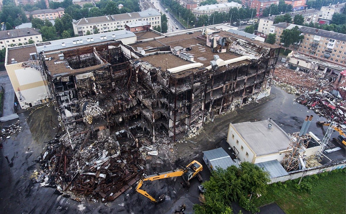 Российский суд, наконец, разобрался, кто виноват (https://www.rbc.ru/society/29/10/2021/617b838c9a7947c7c6d912f0), и вынес приговор. Среди прочих, осуждены руководитель тушения пожара Андрей Бурсин (6 лет колонии), пожарный Сергей Генин (5 лет колонии), охранник ТРЦ Сергей Антюшин (8 лет колонии). В тюрьму попали и сотрудники администрации ТЦ, работавшие в соответствии с указаниями владельца.