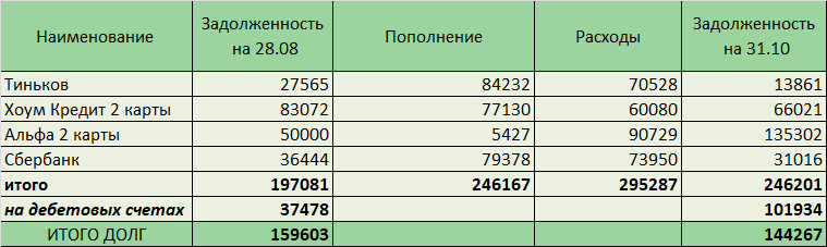 Привет всем марафонцам, кредитоманам и шопоголикам! В эфире - сбор данных по марафону. Эта суббота - последняя в октябре, поэтому я заодно напишу свой отчет за месяц. Тем более что за неделю у меня - без изменений. Жаль, я ведь думала, что зарплата придет пораньше в связи с нерабочими днями. Но такое ощущение, что эти нерабочие дни придуманы неизвестно для кого: куда ни глянь - все работают. Кроме меня! Но я на больничном, это не считается ) В прошлый раз я пропустила и не публиковала свою таблицу по движению денег на картах. Исправляюсь, и пишу таблицу за два месяца: На дебетовых счетах лежит большая сумма (101934р), но половина этой суммы не совсем доступна, т.к. лежит на карте Мегафон. А на ближайшее время мне предстоят вот какие платежи: С учетом предстоящей зарплаты, плюс вывода 20 тысяч через Мегафон, плюс квартплаты друзей - денег на льготный платежи мне хватает даже с излишком. И это очень хорошо! Ну а в общем за месяц я уменьшила долг на 8391р (1 октября был 152658р). Ну а за