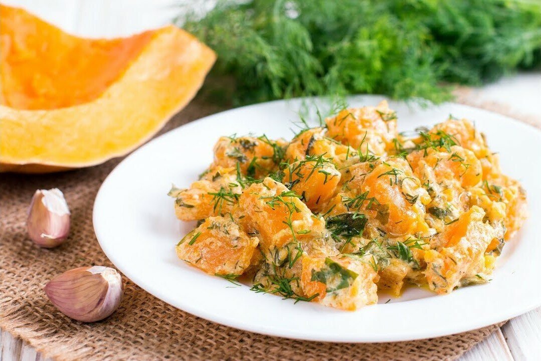 Из тыквы можно приготовить множество блюд. Это очень вкусный овощ, если его правильно приготовить. Тыква в сметанном соусе. Для этого рецепта нам понадобиться: Соус В сметану добавляем мелко нарезанный чеснок, укроп и петрушку. Посыпаем небольшим количеством соли, перца и паприки. Всё тщательно перемешиваем. И всё, сметанный соус готов. Рецепт Для начало моем тыкву и отчищаем её от семян и кожуры. Потом нужно нарезать её крупным кубиком и жарить на сильном огне до образования золотистой корочки. Затем уменьшаем огонь и добавляем туда наш соус и перемешиваем. Потом заливаем водой и солим. После этого закрываем крышкой и оставляем тушиться 5 минут. Достаем, раскладываем по тарелкам и наслаждаемся.