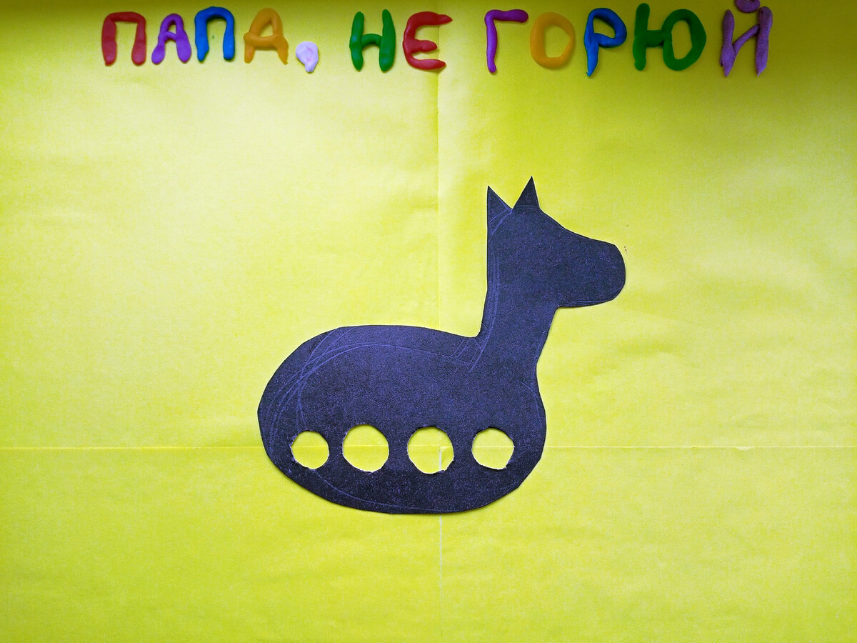 Такого весельчака можно сделать за 10 минут из того, что найдётся дома. Понадобится: Шаг 1 На одном листе картона произвольно рисуем и вырезаем тело лошади без ног. Вырезаем 4 отверстия вряд — по размеру, чтобы пролезли пальцы. Эта заготовка «черновая». Её можно подравнивать, чтобы силуэт получился красивым. Я рисовал без шаблона, это не сложно. Шаг 2 Обводим заготовку на белом (розовом или серебристом) картоне. Вырезаем и её. Складываем вместе, проверяем, чтобы всё совпало. Шаг 3 Собираем остальные недостающие детали: глаза, рог из картона, гриву и хвост из ниток (или упаковочной сетки). По желанию – самоклеящиеся стразы. Шаг 4 Всё это складываем в конверт или коробку и отдаём ребёнку. Чем старше ребёнок, тем больше манипуляций он может сделать самостоятельно. К сожалению, я не могу полностью показать, как поделка будет выглядеть в готовом виде, потому что ещё не вручил её дочке. Но пошагово покажу этапы сборки: 1. Приклеиваем на черновую основу гриву и хвост. 2. Сверху приклеиваем