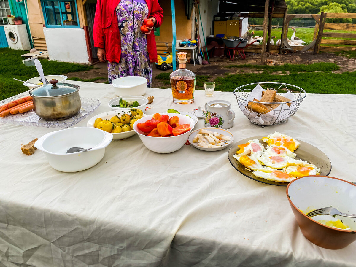 В гостях у Владимира в орловском селе. Стол из домашних продуктов. Накормили 17 кошек и 8 собак
