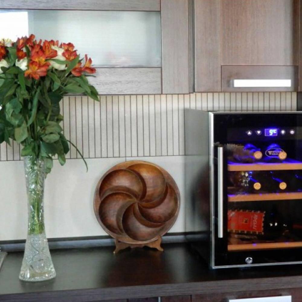 Винотека обладает 2 раздельными камерами с независимыми климатическими зонами. Вы сможете одновременно хранить различные сорта напитка, выставив нужный температурный режим (5-18 градусов). Полки КТ-2412 сделаны из дерева с особыми выемками для бутылок. Они хранятся на полках в горизонтальном положении. Всего вмещается 18 бутылок на 750 мл.