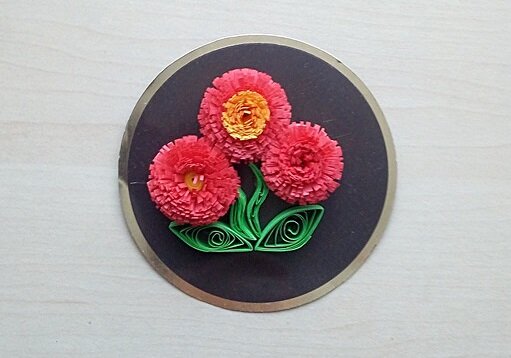 Для работы нам понадобятся следующие инструменты и материалы: — Инструмент для квиллинга; — Клей ПВА с кисточкой; — Маленькие ножнички (если нет — можно обычные); — Полоски для квиллинга: 1) Шириной 1 см. и более (можно 1,5 см., 2 см.) красного цвета (или любого другого цвета — в зависимости от того, каким вы видите свой цветок) — 6 штук + одна широкая желтая полоска для пушистой серединки цветка 2) Шириной 0,5 см. : 1 полоска желтого цвета + 1 полоска любого цвета для нарезки бахромы, полосы зеленого цвета для листиков и стволов — 5-6 шт.; — линейка с кругами различных диаметров — обычная или специальная для квиллинга. Приступаем к изготовлению первой маргаритки с обычной желтой серединкой. Для этого нам понадобятся 2 широкие красные полоски, 1 узкая желтая полоска и одна узкая полоска любого цвета для нарезки бахромы. Берем широкую красную полоску и прикладываем к ее краю узкую (0,5 см.) полосу любого цвета, у меня она — желтая. Придерживая обе полоски рукой, начинаем нарезать бахром