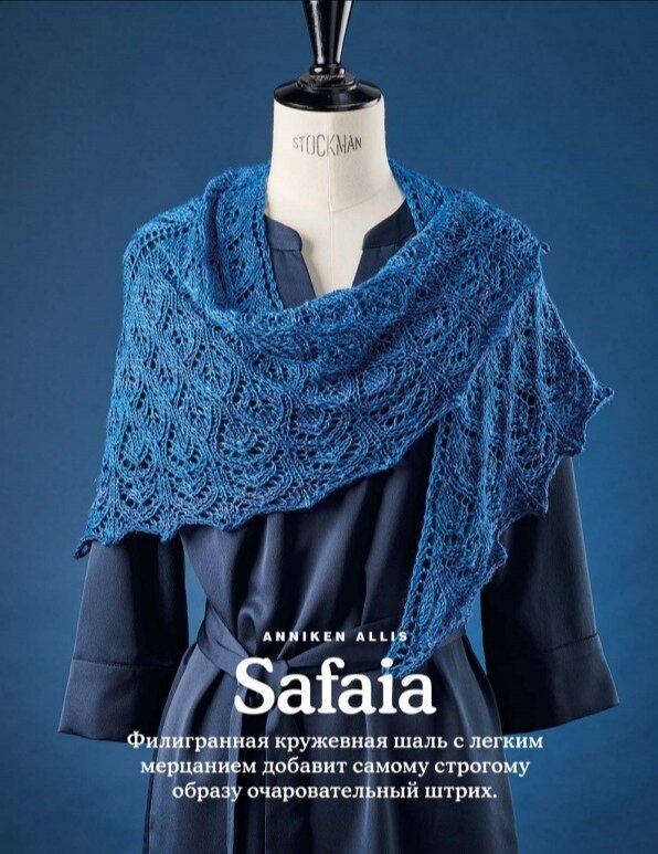 Синяя ажурная шаль в Фарерсском стиле имеет центральный клин и два отходящих от него треугольных "крыла". Прекрасное сочетание шерсти мериноса, кашемира, шёлка и шёлка придаёт шали от Энникен Элис лёгкий блеск.