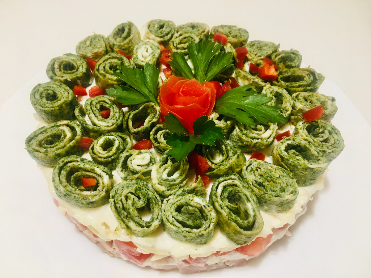 Затем добавляем 0,5 ч л соли, 1 ч л сахара, 1 ч л горчицы,1-2 с т сока лимона или уксуса и хорошо всё размешаем, майонез готов. Густой и вкусный. Для салата приготовим яичные блинчики со шпинатом. Две шайбочки шпината предварительно размораживаем добавляем 2-3 ст л воды, размешиваем . В миску вливаем 2 крупных яйца или 3 маленьких добавляем щепотку соли, чёрного молотого перца, хорошо всё взболтаем и вливаем шпинат, размешиваем. С приго