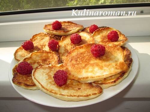 - Готовые оладушки оформите ягодами и сахарной пудрой.