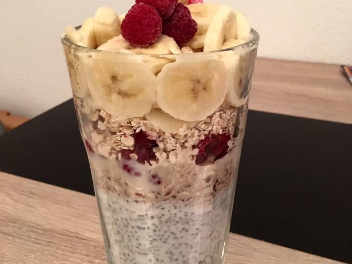 Сегодня я расскажу вам рецепт очень вкусного, питательного и самое главное очень оригинального завтрака Шаг 1: Добавьте семена чиа и горячую воду в высокий стакан, перемешайте и дайте семенам впитаться приблизительно 3 минуты Шаг 2: Добавьте соевый йогурт к замоченным семенам чиа и перемешайте. Шаг 3: Сверху посыпьте злаковыми по вкусу, например овсяными хлопьями Шаг 4: Добавьте сверху замороженную малину или другие ягоды на выбор, но лучше всего использовать замороженные, так как они помогают овсяным хлопьям впитаться. Шаг 5: В завершение добавить овсяные хлопья и залить ванильным, соевым напитком. Охладите в течение не менее 3 часов, но лучше всего на всю ночь. Подавать с нарезанным сверху бананом. Приятного аппетита! #завтрак #рецепты #коктейль #вкусный завтрак #простые рецепты #кулинария #кулинария рецепты