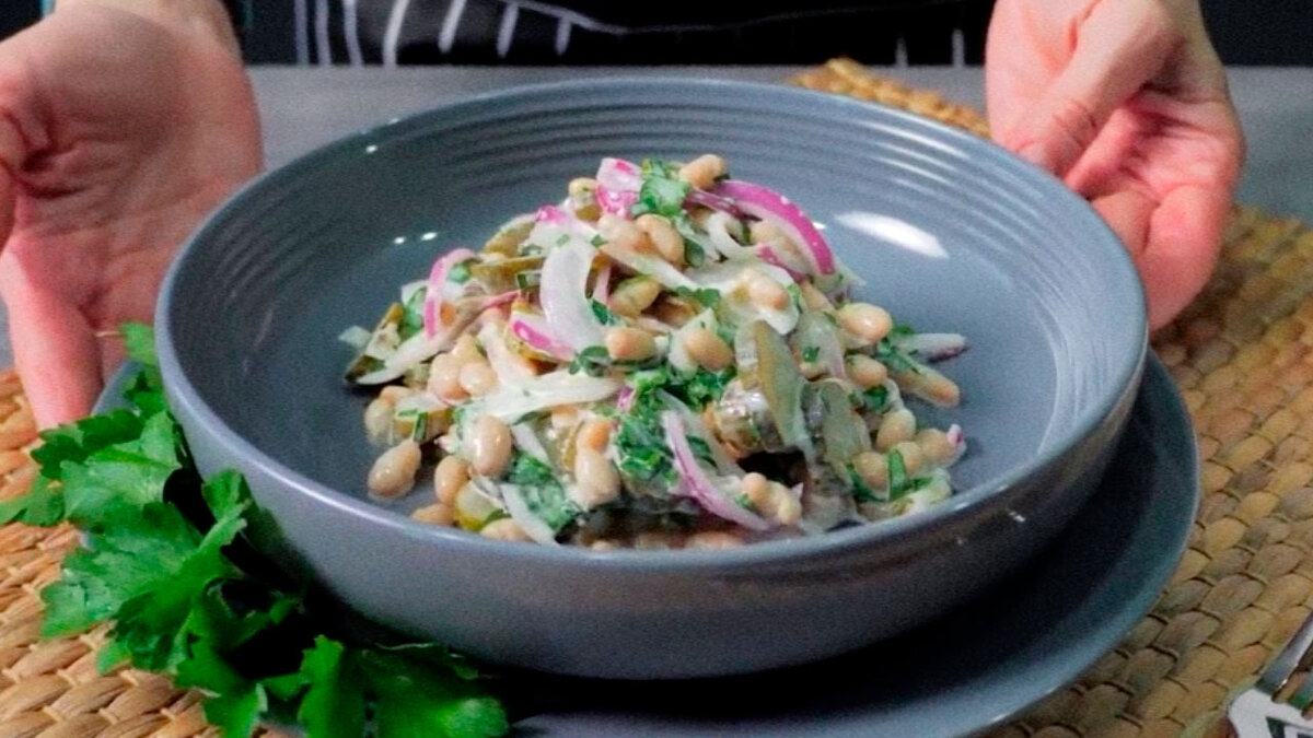 Здравствуйте дорогие! С вами Виктория и канал "Перечница". Для приготовления салата потребуется 3 основных ингредиента: фасоль, огурцы, лук. Несколько минут на шинковку продуктов и столько же времени, чтобы приготовить домашний майонез. В салате нет мяса. В роли белка - консервированная фасоль. Покажу как на основе жидкости от фасоли можно сделать постный домашний майонез. Ингредиенты: Для салата: Для домашнего майонеза: Приготовление: 1 красную луковицу очистить от кожуры. Нарезать полукольцами и разобрать руками на более мелкие составляющие. В миску насыпать 1 чайную ложку сахара. Добавить 0,5 чайной ложки соли, 1 столовую ложку яблочного уксуса 6% и 100 миллилитров кипятка. Маринад перемешать до растворения соли и сахара. Лук добавить в горячий маринад и перемешать. Оставить на 20-30 минут мариноваться. Открыть банку фасоли и слить жидкость в ёмкость блендера. У меня получилось около 100 миллилитров жидкости. Добавить 150 миллилитров рафинированного растительного масла, 1 чайну