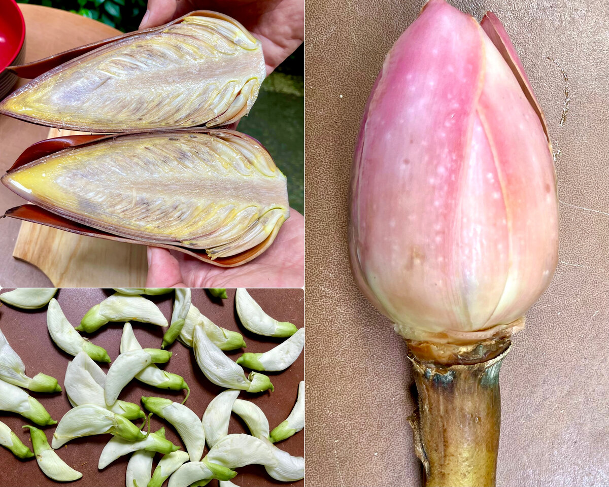 В Индонезии и на Бали в частности практически в каждом растении используют в пищу все его части. Цветки растений не исключение! Ниже представлены 3 вида цветков, которые часто продаются в овощных лавках, из чего можно сделать вывод, что они довольно популярны среди местного населения! 1️⃣ Цветки Колибри Цветки дерева Сесбания, которые также называют Колибри из-за их сходства с птицей, есть продаже в овощных лавках только во время цветения дерева. Цветки жарят с добавлением соусов и овощей. Получается вкусно, несмотря на то, цветки сохраняют немного горечи. 2️⃣ Цветки Этлингера Бутоны встречаются в продаже реже. В Индонезии в салаты часто добавляют кислые фрукты, плоды и некоторые цветки растений. Цветки Этлингеры - одни из них благодаря их кисло-сладкому вкусу. Лепестки можно использовать вместо лимона и добавлять в чай, или заварить сами лепестки и пить в виде чая. Аромат стоит очень приятный по всему помещению. 3️⃣ Цветок банана Из всех цветков цветок банана используется в пищу