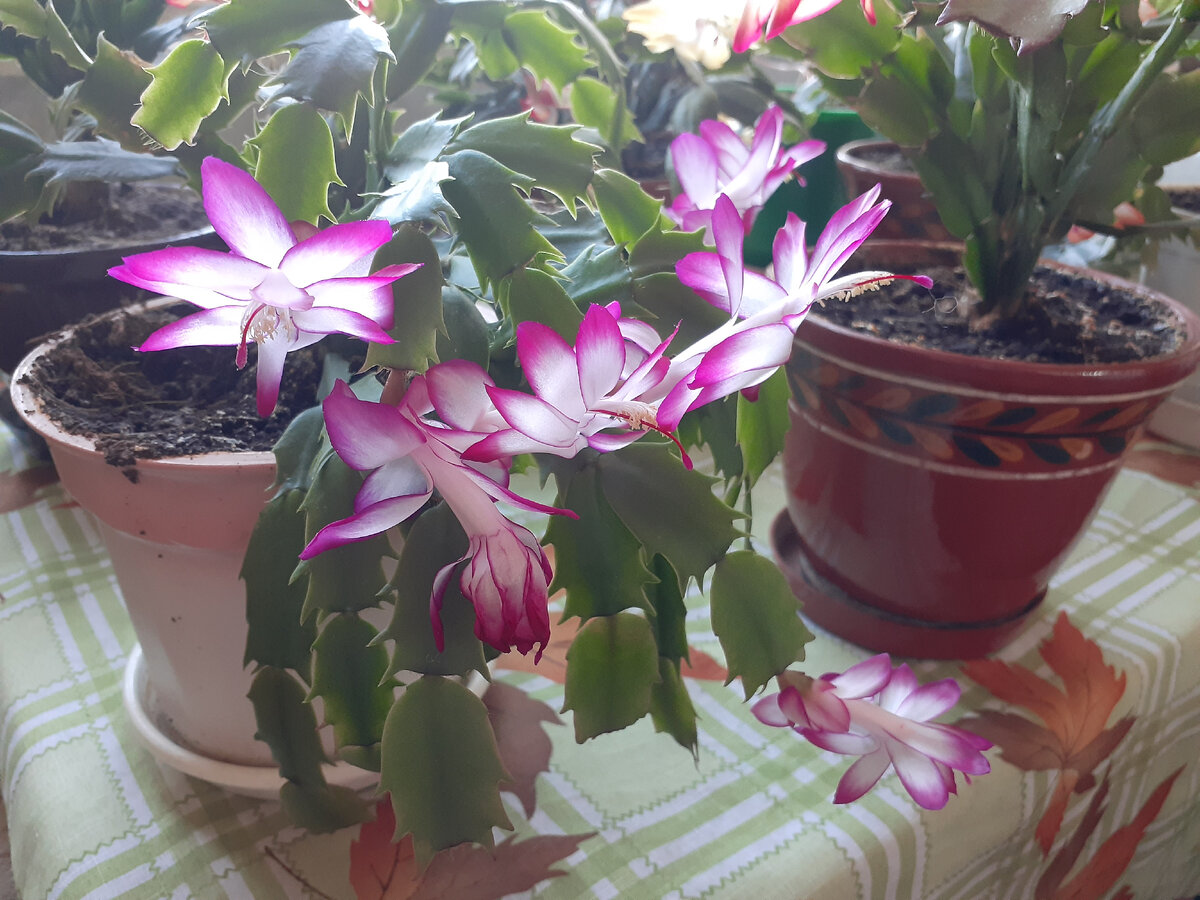 Дружно зацвели декабристы (шлюмбергеры), стоило их только принести с балкона домой. И это не удивительно, на балконе стало холодно. Цветы перенесли период покоя и теперь им пора цвести :) Всего декабристов у меня шесть. Бело-фиолетовый. Бело-красный. Не совсем, около красной каемки есть немножко желтого. Оказалось два одинаковых декабриста. Декабрист цвета слоновой кости, обычно, зацветает первым. А бело-оранжевый зацветает последним. Есть еще белый. Но он пока состоит из двух листочков. Вид сверху. Зацветает кислица. А орхидея цвести не торопится. Она, вообще, все делает медленно :) А очиток на клубе продолжает цвести, не смотря на выпавший снег. Вот молодец! :)