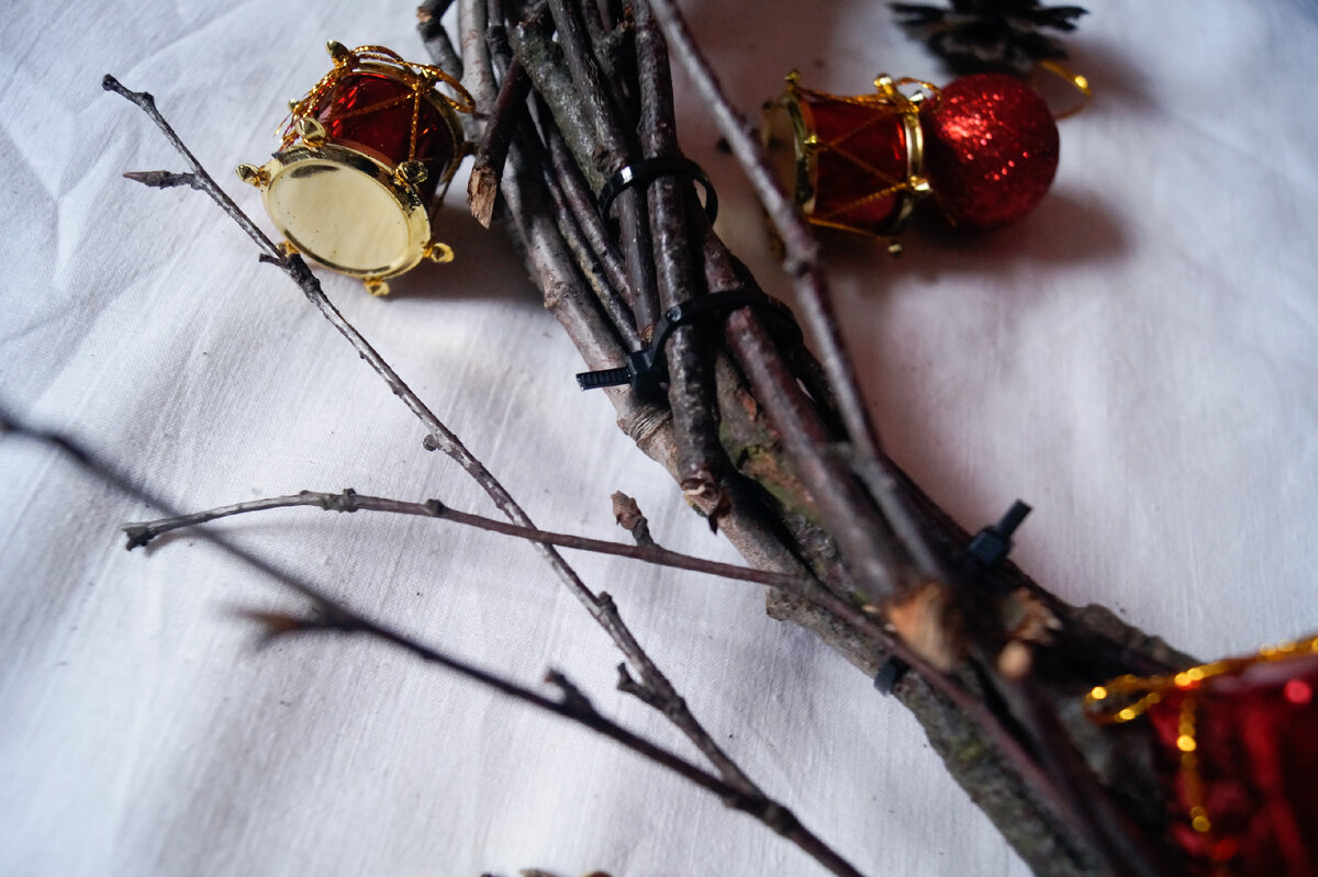 Такая основа подойдет не только для рождественского венка, но и для цветочного, осеннего и любого другого. Мастер-класс по изготовлению новогоднего венка можно посмотреть здесь. Собирать прутья можно в любое время года! Вам подойдут длинные тонкие упругие прутики любой длины. Главное, чтобы они были гибкие. Однако если вы нашли чудесные, но сухие - дома замочите их на пару часов перед тем, как делать из них основу. Для изготовления основы для венка вам понадобятся: стяжки (15-20 штук) и прутья в любом количестве. Я лично люблю не очень толстые изящные основы, но они могут быть любыми, в зависимости от вашей задумки. На основу на фото ушло примерно 20 прутиков. Возьмите в охапку несколько штук (5-7) так, чтобы их основания были сдвинуты относительно друг друга. Если же их взять как букет, в одном месте основа получится слишком толстой. В одном-двух местах скрепите их стяжками. Далее сверху добавьте еще несколько штук, накладывая наполовину на нижние и так же скрепляя их между собой стяж