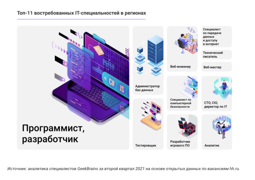 Сфера технологий развивается повсеместно с огромной скоростью. Согласно исследованию образовательной платформы GeekBrains, самые востребованные IT-специалисты — это программисты. Высокий спрос объясняется массовой цифровизацией бизнеса. Она началась ещё до пандемии, но в 2020 году сильно ускорилась: компании стали переносить процессы в онлайн и запускать с нуля собственные IT-продукты, чтобы привлечь клиентов.