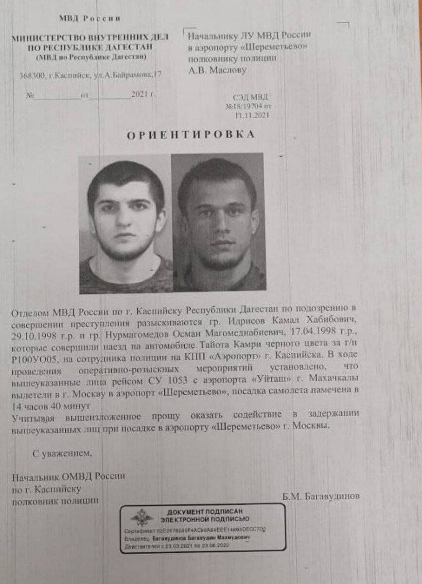 Сегодня утром по пути в аэропорт он со своим соучастником Камалом Идрисовым на машине наехал на полицейского, который стоял у КПП. Брата Хабиба задержали в аэропорту «Шереметьево».