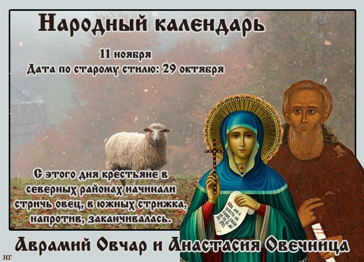 11 ноября-Анастасия Овечница, Аврамий овчар. По названию понятно, что Анастасия и Аврамий считались на Руси небесными покровителями и овец и овечьих пастухов. Святая Анастасия жила в 3 веке в Риме. По вероисповеданию христианка. Она активно проповедовала Христову веру и требовала отказаться от поклонения языческим богам. За это градоначальник приказал выставить девушку обнаженной перед народом, затем подвергли ее жестоким пыткам и казнили. Преподобный Аврамий жил в 11 веке в Ростове. По преданию, Аврамий построил себе скит на озере Неро, где в то время проживали племена меря и весь, которые были идолопоклонники и поклонялись богу Велесу. Однажды преподобному явился апостол Иоанн Богослов , который вручил ему железный посох увенчанный крестом и велел сокрушить этим жезлом идола. Аврамий сделал, как сказал апостол, а на месте где стоял идол построил храм во имя Иоанна Богослова. Впоследствии преподобный Аврамий в Христову Веру обратил много язычников. В осенний день11 ноября пра