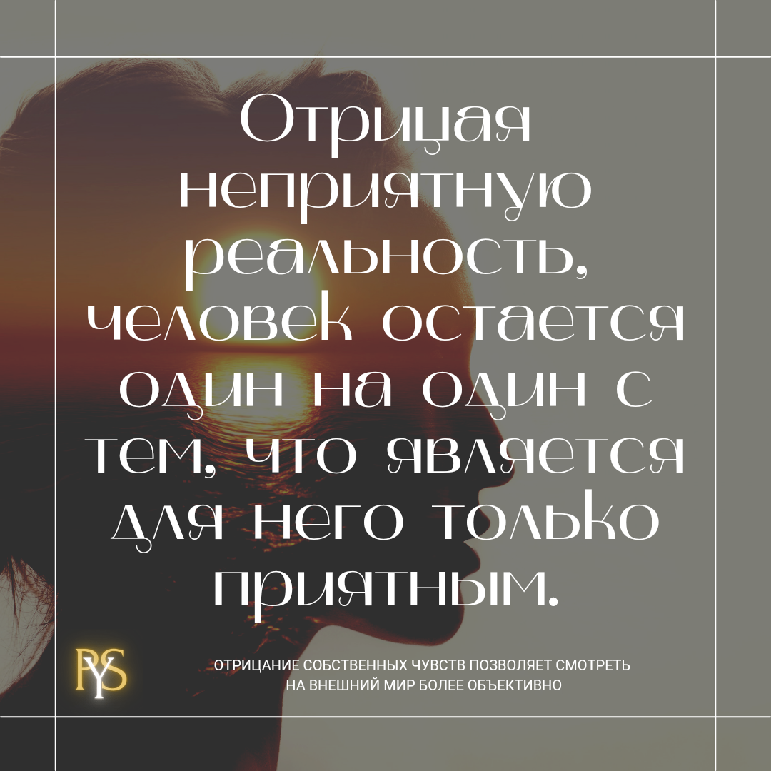 Отрицание - это психологическая защита, которая является одной из базовых. Она часто включена в работу других психологических защит. Суть её функционирования - это прямое или частичное игнорирование реальности и фактов. Причем, речь идет не про ложь или обман, которые направлены “вовне”, к другим людям. Отрицание как психологическая защита - это игнорирование реальности прежде всего в своем собственном сознании. Отрицание может проявляться по разному и на разных уровнях. Это может быть отрицание каких-то фактов собственной истории, или отрицание своих чувств в ситуациях, где их проявление не принято или нежелательно. В самых ярких формах это может быть даже отрицание фундаментальных законов реальности. Понятно, что чем более “мощным” является отрицание, то тем более основательные психологические проблемы за этим процессом стоят. Интересно, что внутренне человек может очень хорошо переживать отрицание. Он может даже переполняться позитивными чувствами. Отрицая неприятную реальность, чел