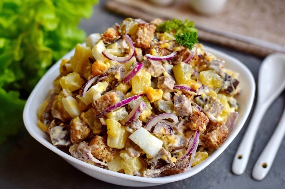 Мясные салаты всегда относятся к категории сытных и питательных блюд, которые можно подавать на стол самостоятельно, без гарниров и закусок. Предлагаем рецепт вкусного салата с говядиной. Именно мясо говядины придает салату свой узнаваемый вкус и аромат. Изюминкой блюда являются чесночные ржаные сухарики, приготовленные самостоятельно. Салат подается на стол сразу после приготовления, пока сухарики остаются хрустящими. Ингредиенты: Приготовление: В первую очередь подготовьте ржаные сухарики для салата. Черный хлеб нарежьте кубиками, уложите на разогретую масляную поверхность сковороды, слегка их обжарьте до румяности, после добавьте измельченный чеснок, обжаривайте еще 1 минуту, снимите с огня. Оставьте сухарики на сковороде до остывания, чтобы они пропитались чесночным маслом, стали твердыми и хрустящими. Через время выложите их на салфетку. Картофель сварите в кожуре до мягкости, остудите, очистите, нарежьте кубиками, отправьте в глубокую емкость. Заранее отварите говядину до готовно