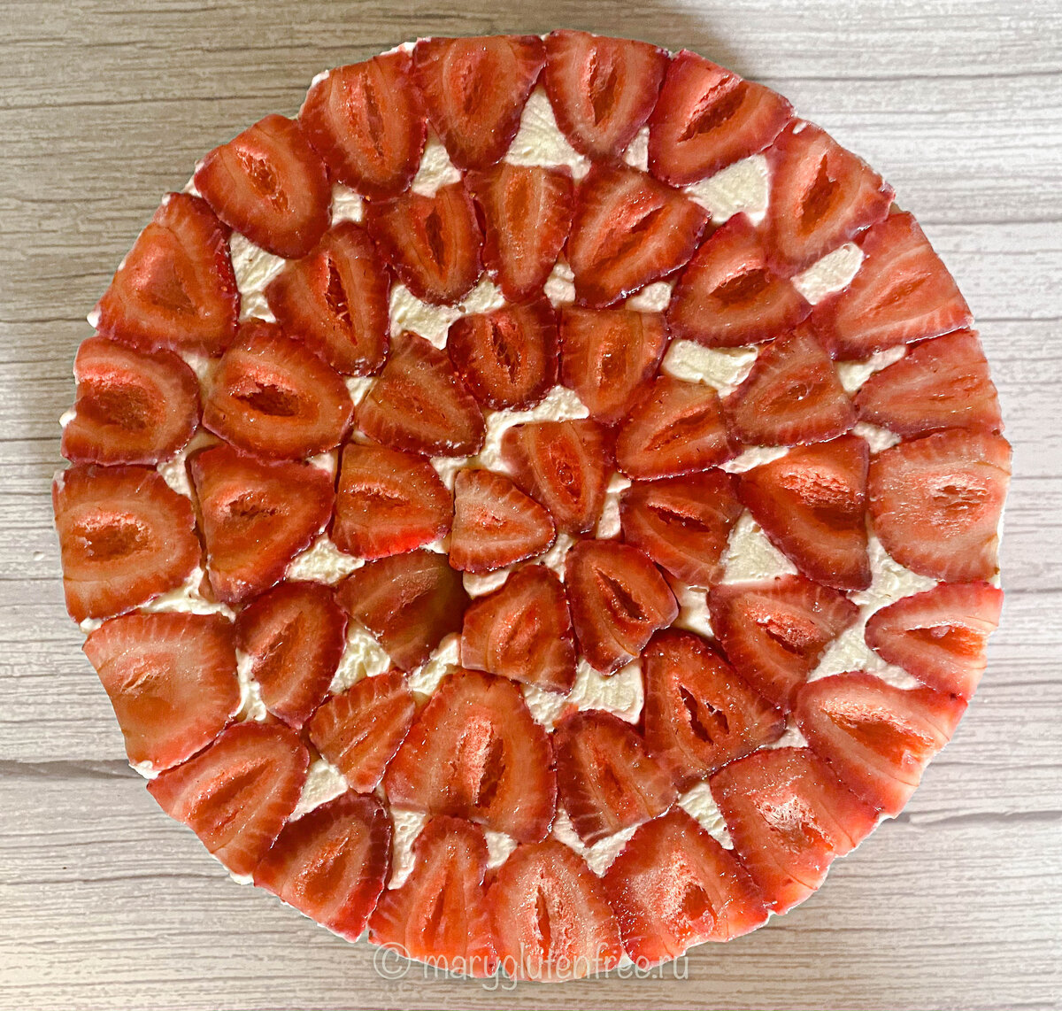 На клубнику крем (половину от общего количества), тщательно заполняя промежутки между клубникой.