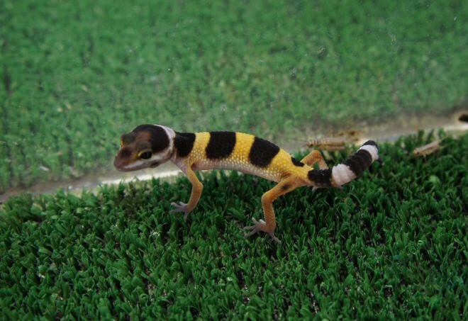 - Особи старше года должны получать пищу 2-3 раза в неделю. За раз эублефар может съесть до пяти сверчков. До месяца ящерице дают по сверку 1-2 раза в день, а в возрасте 1-3 мес. раз в день дают по два насекомых. Чем старше питомец, тем реже его кормят.
