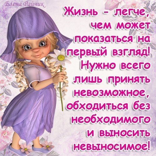 И снова "о женщинах"! Взгляд мужской и женский. В осеннюю погоду начинаешь перебирать вещи, пересматривать раннее отложенные дела. А иногда просто пересматриваешь то , что нравилось. Мой приятель несколько лет тому назад создал (собрал) у себя целую коллекцию женских высказываний с весёлыми рисунками под названием "Картинки Елены Райчик". Прислал и мне. Мне понравились. И вот сейчас снова пересматриваю с любопытством. Поискал, кто же это Ел. Райчик? Ничего конкретно-вразумительного... Так, туманно.... Или я не понял. Но, картинки пересмотрел с удовольствием и с улыбкой. Очень мило. Вот небольшая часть из коллекции: Улыбайтесь! И хорошего настроения Вам в любую погоду!