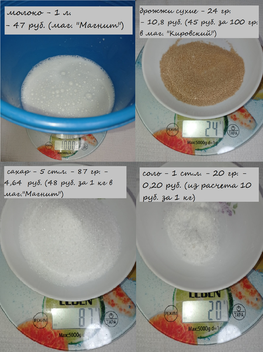 Стоимость полученного сдобного дрожжевого теста у меня вышла 157,08 руб. за 2,360 кг. Для начала приготовим опару, тем самым запустим дрожжи в работу и проверим их работоспособность. В подогретое молоко добавляем дрожжи, сахар, соль все взбиваем венчиком и следом 2 стакана просеянной муки. Хорошенько взбиваем все ингредиенты и полученную смесь оставляем минут на 20. Этого будет достаточно, чтобы понять активизировались дрожжи или нет. У меня опара простояла 40 минут и пока я подготавливала следующие продукты, чуть не сбежала из ведра, а это значит дрожжи хорошие. Дальше добавляем масло, майонез и яйца. Причем майонез я использую домашний. По моим подсчетам его стоимость получается 26 руб. за 250 мл. Всем известно, что 1 ст.л. это 20 мл. воды. А майонез достаточно густой консистенции, поэтому набирается приличная горка. В моем приготовлении подобная ложка майонеза вытянула на 40 мл. Последним этапом добавляем муку. У меня получилось 5 стаканов. Так же просеиваем, и так же хорошенько п