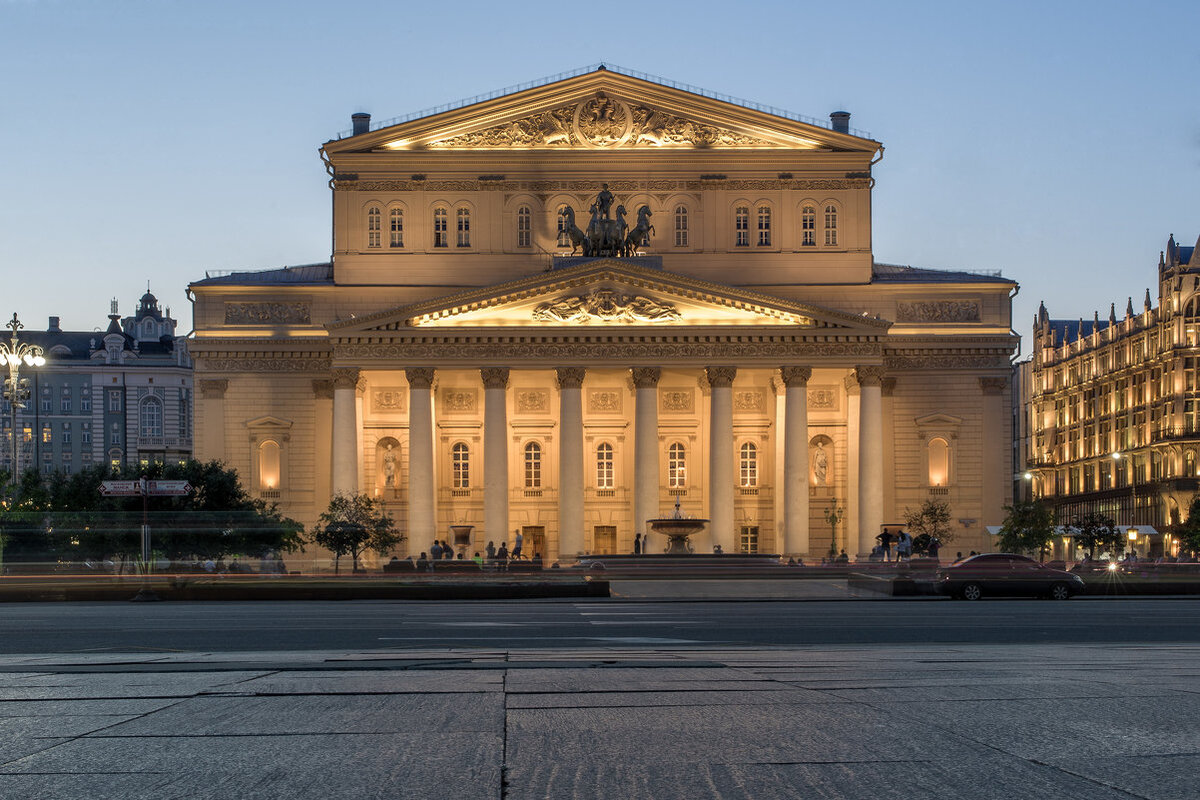 Это здание известно всем в нашей стране, даже тем людям, кто в Москве никогда не был. Оно изображено на сторублевой купюре банка РФ. Первый театр на этом месте возник в 1780 году и именовался по улице - Петровским. Здание сгорело в 1805 году. Новое здание, построенное по проекту архитектора О.И. Бове было построено в 1824 году, но и его постигла та же печальная участь - пожар. В 1856 году архитектор А.К. Кавос построил нынешнее здание, в которое гармонично вошли капитальные стены, величественная колоннада и квадрига бронзовых коней на фронтоне, построенные Осипом Бове. Поэтому большинство людей и сейчас все - таки считают это здание творением О.И. Бове. С 2005 по 2011 год проведена масштабная реконструкция здания театра, которая не затронула внешний вид здания. На Петровку Большой театр выходит своим боковым фасадом с галереей на чугунных столбах вдоль первого этажа здания