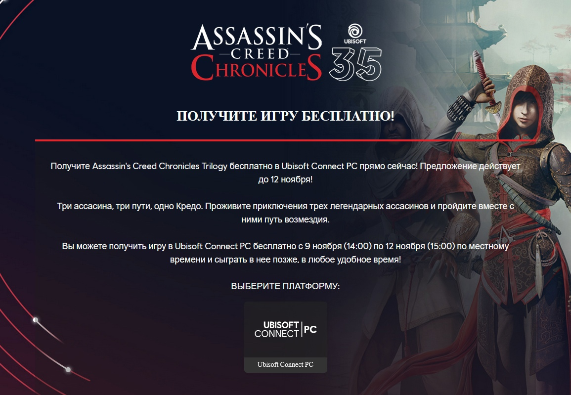 Вы можете получить игру в Ubisoft Connect PC бесплатно с 9 ноября (14:00) по 12 ноября (15:00) по местному времени и сыграть в нее позже, в любое удобное время!