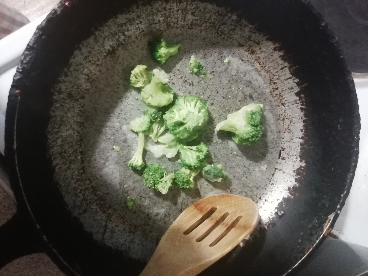 Заранее извиняюсь за внешний вид сковороды! Были у бабушки на даче, у нее там только такая сковорода, чугунная)) Другие она не признает. Теперь к самому рецепту)) Я редко готовлю брокколи, потому что в нашей семье брокколи особо никто не ест, хотя это полезный и вкусный продукт. Но вот это блюдо все уплетают с удовольствием. Делюсь своим рецептом. Итак, у меня брокколи в замороженном виде. Можно использовать и в свежем. На сковороде разогреваем кусочек сливочного масла, кладем брокколи (разделить на части). Обжариваем 1-2 минуты. Даже если брокколи замороженные - быстро оттают и начнут жариться. Затем разбиваем яйца, солим, перчим по вкусу и аккуратно перемешиваем. Мешаем до тех пор, пока яйца полностью не приготовятся - это займет 1-2 минуты. Вот и все)) Выкладываем на тарелку, и можно есть)) Очень вкусно! В дополнение на тарелку можно положить слабосоленую красную рыбку и тост (или просто хлеб). Приятного аппетита, мои дорогие! P.S. Кстати, если кто-то знает, как отчистить от нагара
