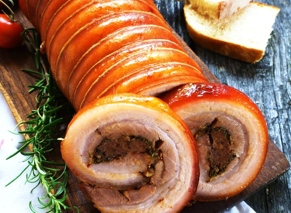 Рулет из шкурки сала — это здоровая и калорийная еда. Хорошо подойдет для праздничного стола и как самостоятельное блюдо, и как закуска. Для рулета выбирайте длинный кусок сала, чтобы можно было его скрутить. При покупке отдавайте предпочтение салу с корейки (со спины) — оно мягкое и нежное. Также обращайте внимание на цвет: сало не должно быть желтым или серым. Это означает, что оно старое или порченое. Добавляйте в рулет свои любимые пряности. ПРОДУКТЫ ДЛЯ РУЛЕТА: На 10 порций: Свиное сало700 г Морковь140 г Репчатый лук75 г Горчица20 г Чеснок1 головка = 50 г Смесь перцев12 г Соль30 г Мед10 г ДЛЯ ПОДАЧИ: Свежая зелень30 г ПОДГОТОВИТЬСЯ: Разложите удобно все продукты. Подготовьте фольгу, пакет, нитку, корейскую или обычную терку. НАЧАТЬ ГОТОВИТЬ: 1. Начните приготовление. Смешайте в миске мелко нарезанный чеснок от половины головки, мед и соль. Намажьте полученной смесью сало с внутренней стороны. Сверху обмажьте горчицей и посыпьте перцем. Натрите на терке морковь и распределите по са